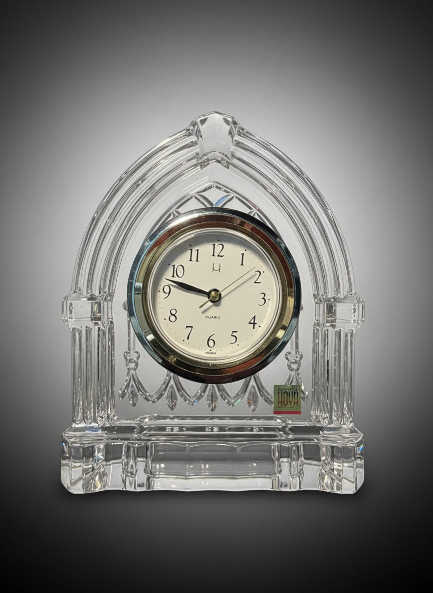 A Hoya Crystal Tokyo quartz clock isa collectible, vintage desk or mantle clock from Japan, known for its heavy, clear crystal glass body, precise battery-powered quartz movement (like Bulova or Seiko mechanisms), and elegant designs, often featuring gold bezels, intricate cuts, or unique elements like rotating airplane hands, representing quality craftsmanship from the latter 20th century.