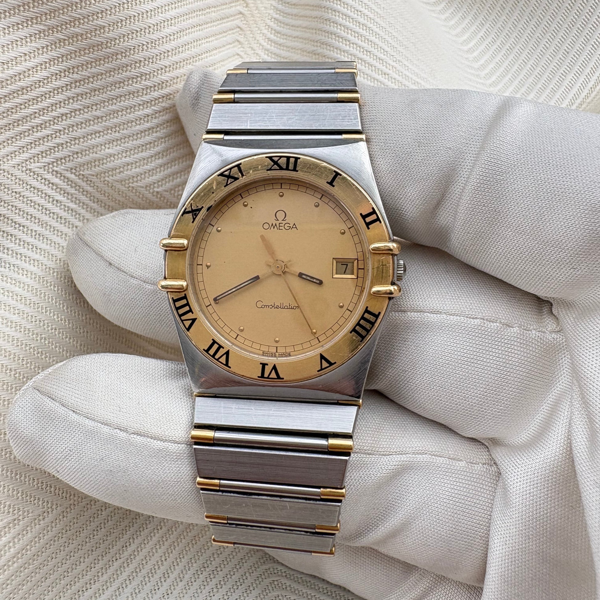 OMEGA CONSTELLATION 18K SOLID GOLD BEZEL QUARTZ VINTAGE 1980S PREOWNED WATCH